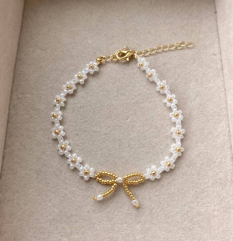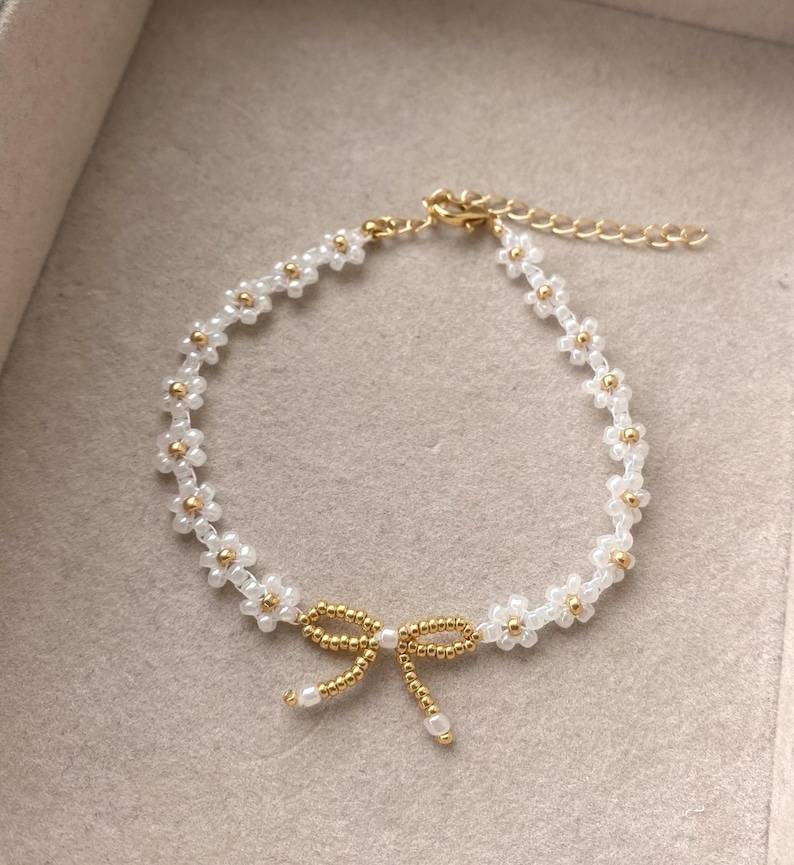 สร้อยข้อมือลูกปัดดอกไม้เดซี่สร้อยข้อมือสีขาวไข่มุกดอกไม้เครื่องประดับทำมือสวยงามของขวัญวันเกิดของเธอ