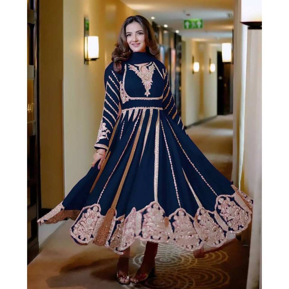ชุดเดรสทรงเอไลน์สวยงาม พร้อมผ้าคลุมไหล่ปักลายประณีตด้วยงานปักเลื่อม