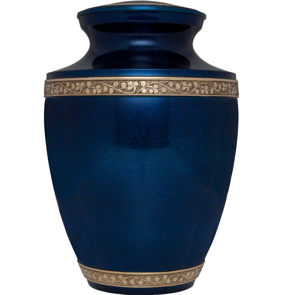 โกศบรรจุอัฐิสำหรับผู้ใหญ่ ทำจากทองเหลือง/อะลูมิเนียม สีน้ำเงินโบราณ แกะสลักอย่างสวยงาม สำหรับใส่เถ้ากระดูกหลังการฌาปนกิจศพ