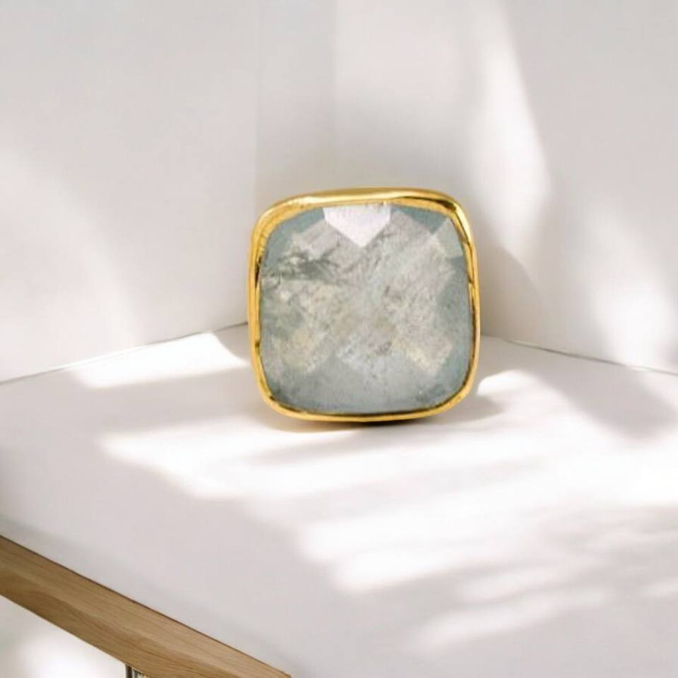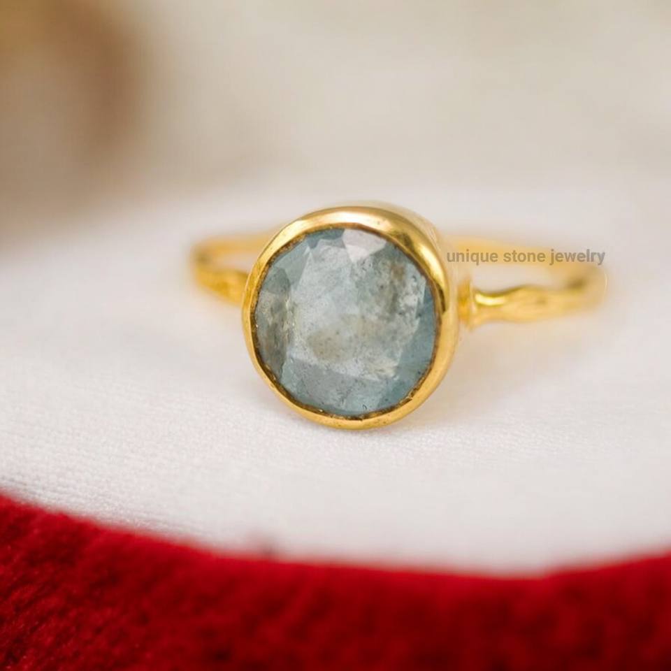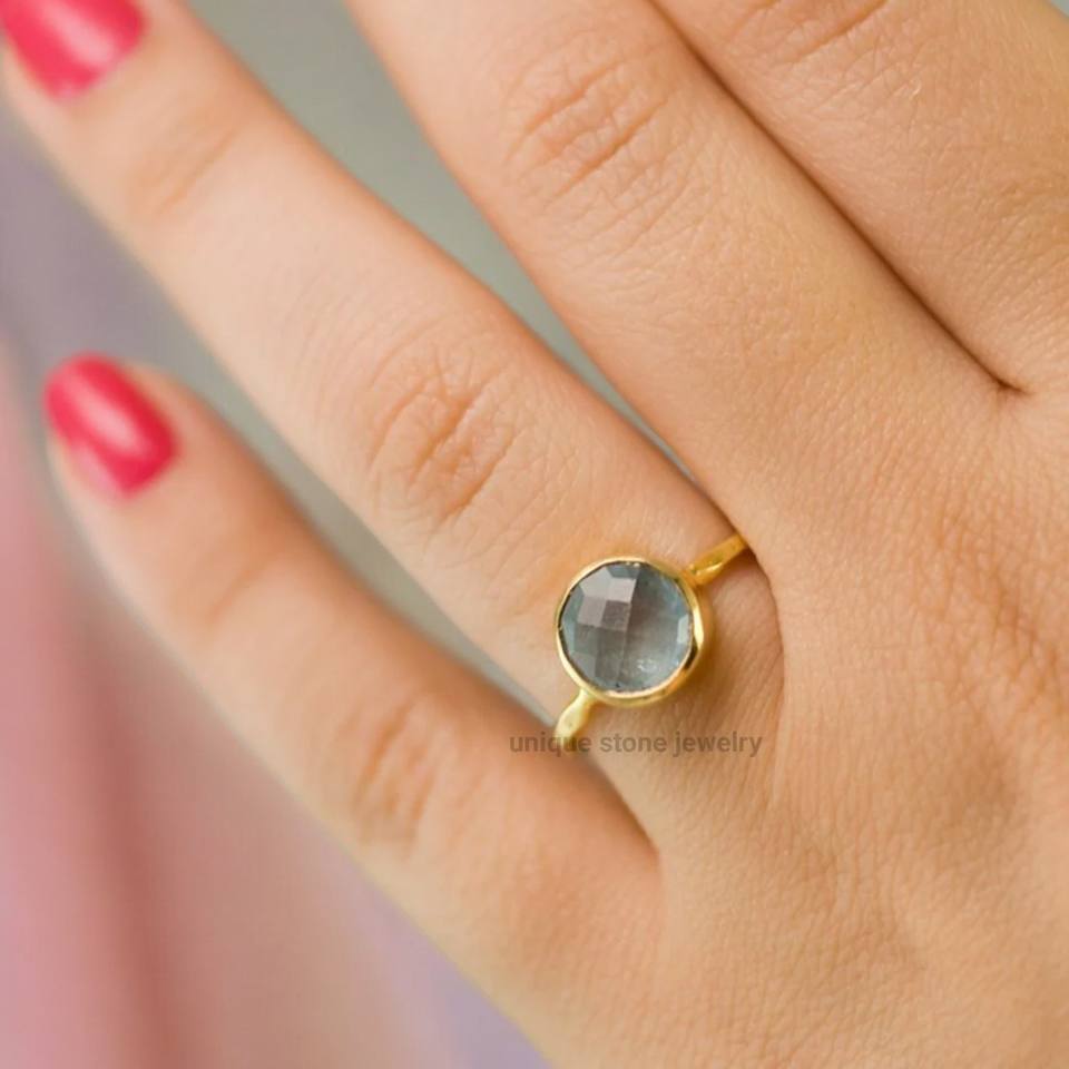 แหวนหมั้นผู้หญิงสไตล์โบฮีเมียนทำมือจากเงินแท้ 925 ประดับพลอยอะความารีนสวยงาม ตัวเรือนชุบทอง