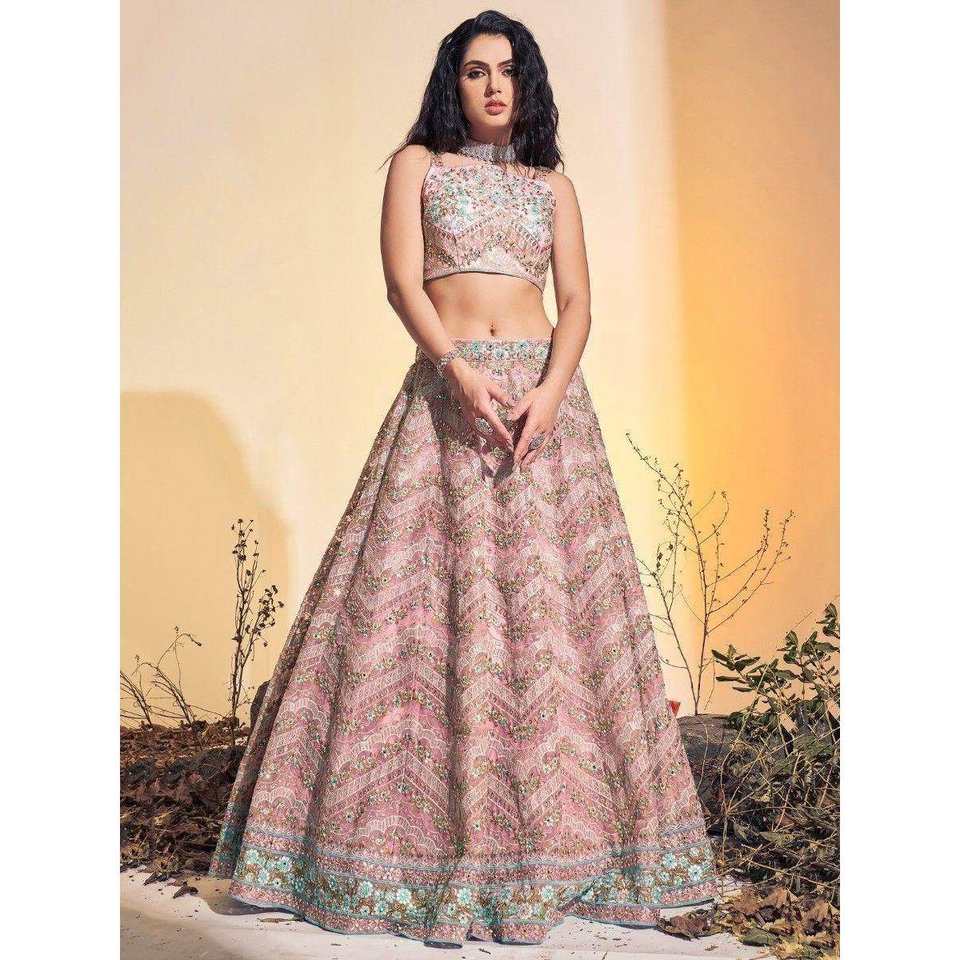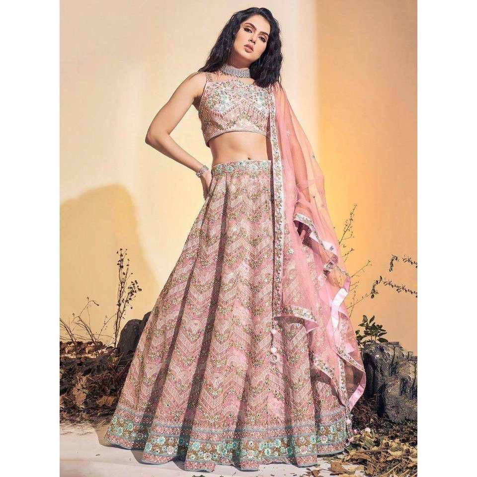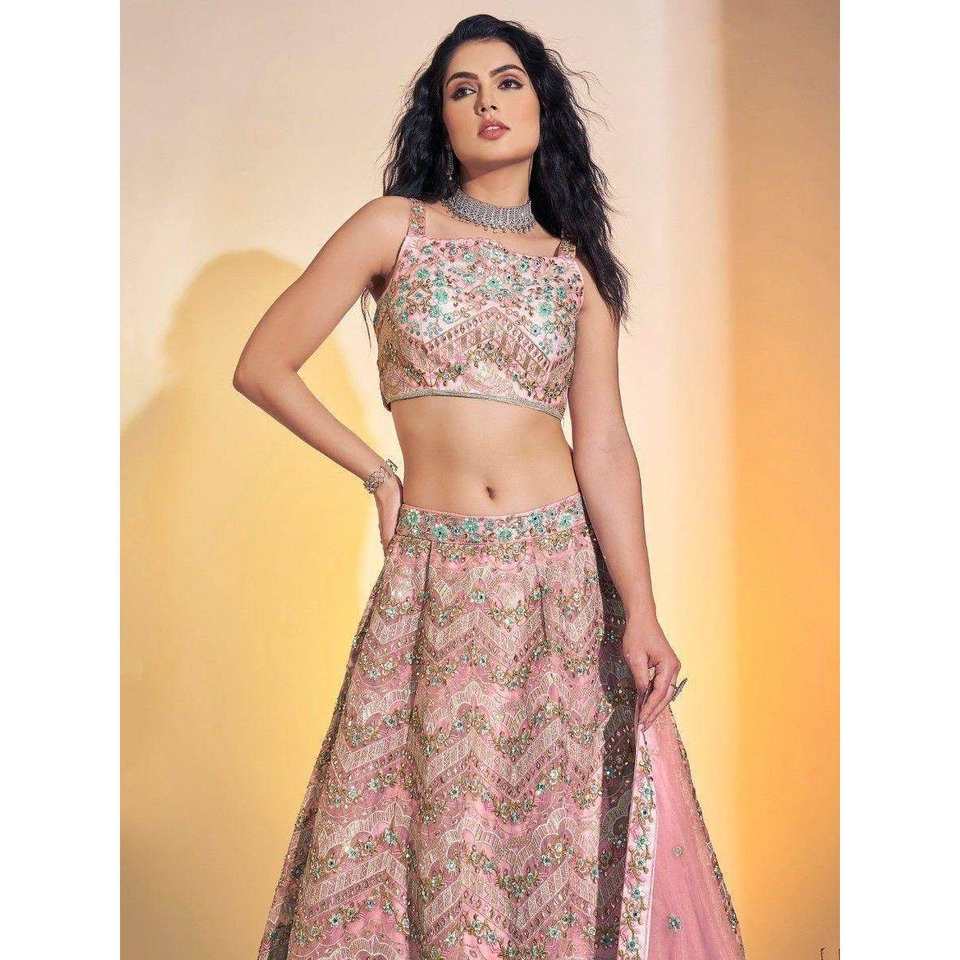 ชุดเลเฮนกาโชลีผ้าเน็ตเนื้อนุ่มปักลายสีชมพูอ่อนสวยงาม พร้อมผ้าคลุมไหล่สำหรับงานแต่งงาน