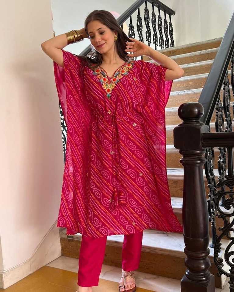 ชุด kaftani Kaftan Kaftan kurti สีแดงแบบดั้งเดิมพร้อมกางเกง & dupatta ชุด3ชิ้น
