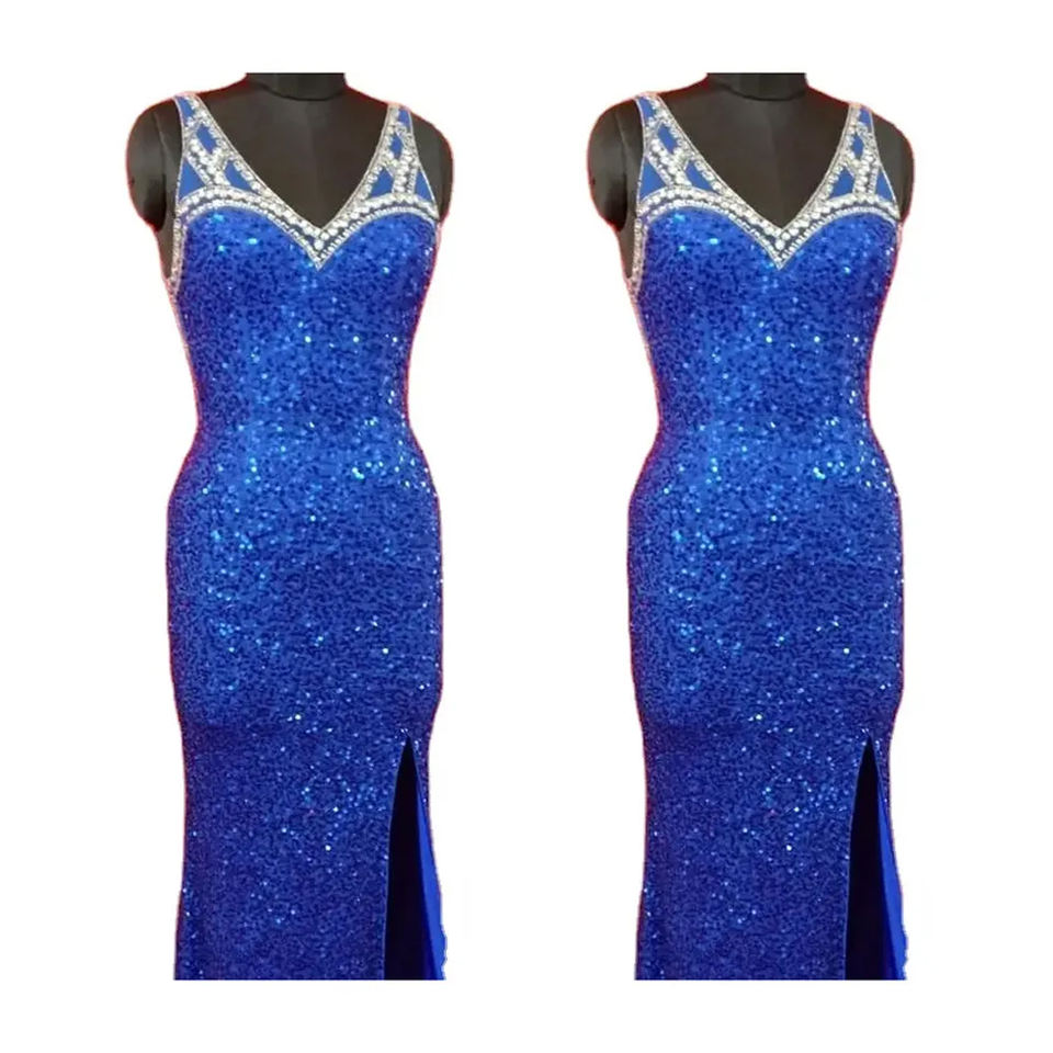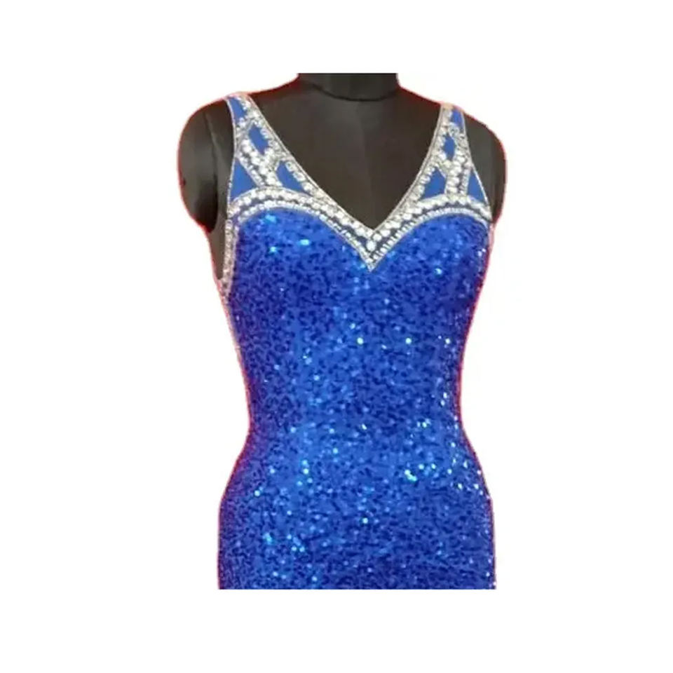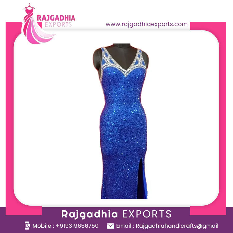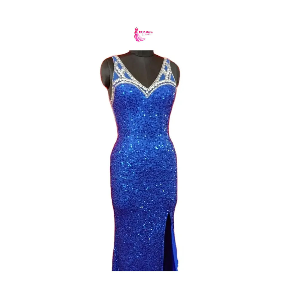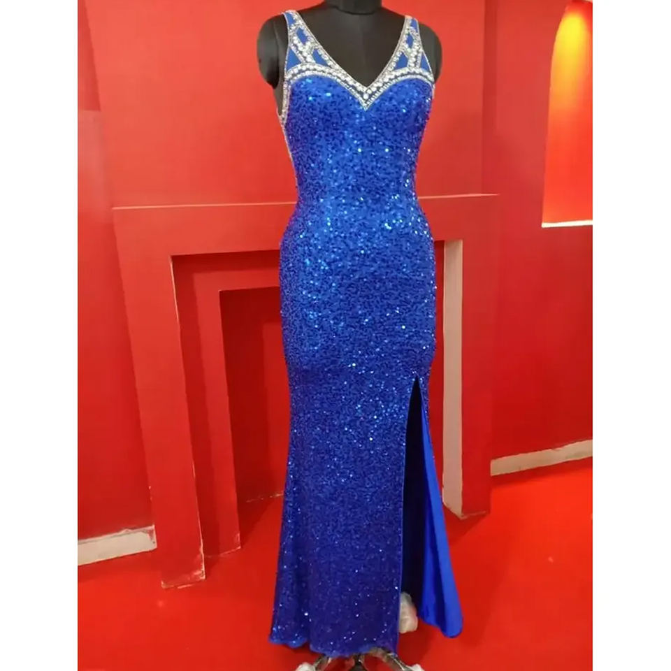 ชุดราตรีผ้าคอตตอนสีฟ้าสวยชุดแมกซี่แขนสั้นคอวีดีไซน์สุดพิเศษพร้อมลูกปัดขนาด XL