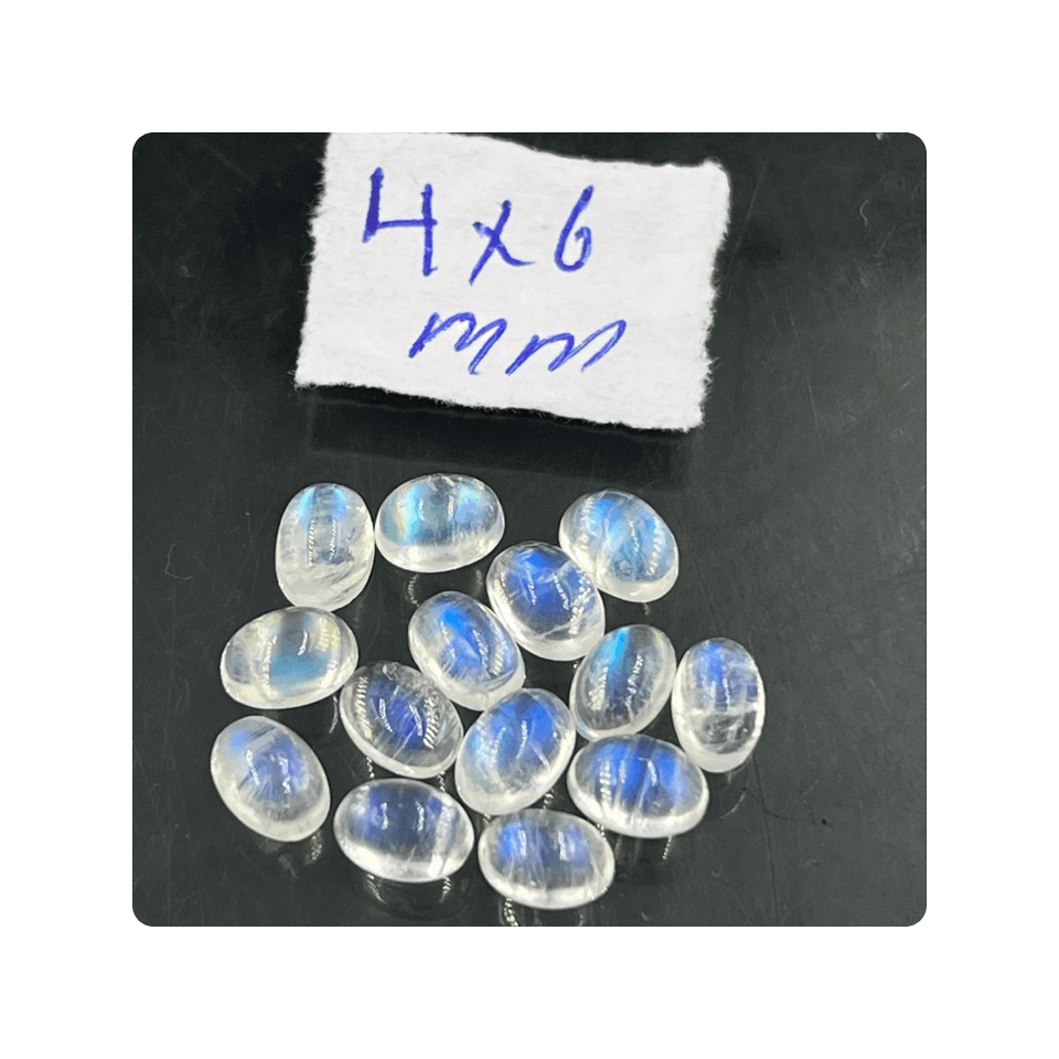 ลูกปัดมูนสโตนสีรุ้งเพลิงสีฟ้าสวยงามขนาด4x6มม. พลอยทรงวงรีคุณภาพสูงสำหรับการทำเครื่องประดับ