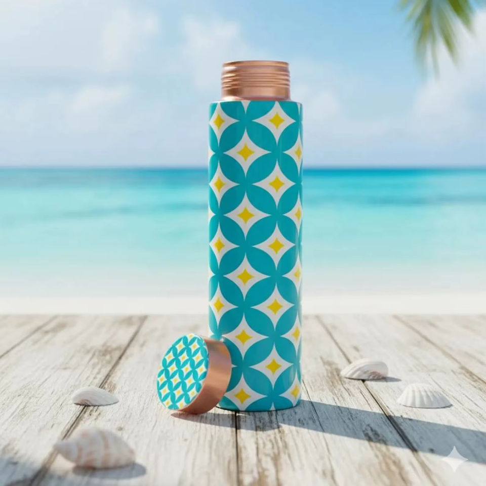 ขวดน้ำทองแดงแท้ทรงเพรียวบาง สีฟ้าสวยงาม ขนาด 750 มล. ดีไซน์เรขาคณิต ฝาปิดกันรั่ว เหมาะสำหรับใช้ในบ้าน สำนักงาน และการเดินทาง