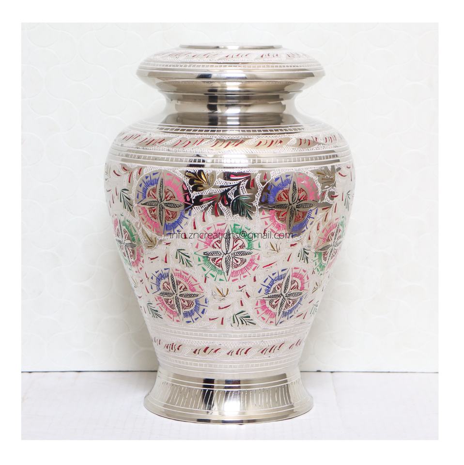 โกศแกะสลักทองเหลืองที่สวยงามงานศิลปะโลหะตามสั่งสำหรับเก็บขี้เถ้าสำหรับผู้ใหญ่วิธีการพิมพ์พิเศษ