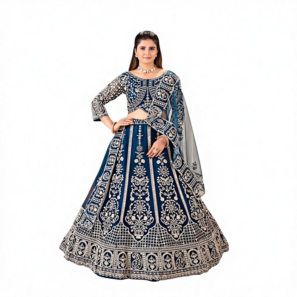 ชุดเลเฮนกาโชลีเจ้าสาวแสนสวย ผ้าจอร์เจตต์ แต่งขอบด้วยขนเฟอร์เทียม ปักลายผีเสื้อ ดีไซน์แบบดั้งเดิม ทำจากวัสดุรีไซเคิล