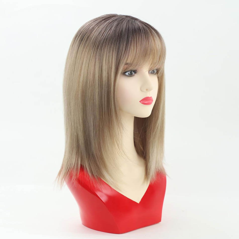 วิกผมบ็อบสังเคราะห์สีน้ำตาลผสมหน้าม้าทนความร้อน10นิ้วดูเป็นธรรมชาติทรงผมของผู้หญิง