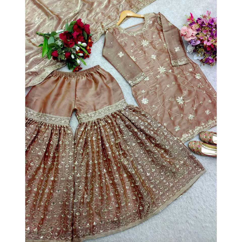 ชุดราตรีสีน้ำตาลสวยงามพร้อมผ้าคลุมไหล่และผ้าคลุมศีรษะ ประดับด้วยงานปักเลื่อม ไซส์ L สำหรับงานปาร์ตี้และงานกลางคืน
