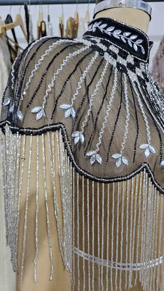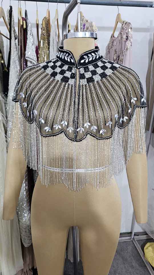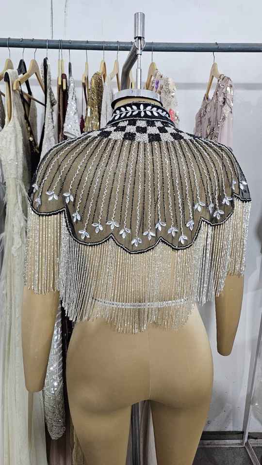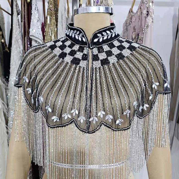 เสื้อคลุมเบอร์เลสก์ที่สวยงามพร้อมลูกปัดปักเลื่อมที่คอสำหรับการเฉลิมฉลองเทศกาลที่ทำจากวัสดุโลหะ