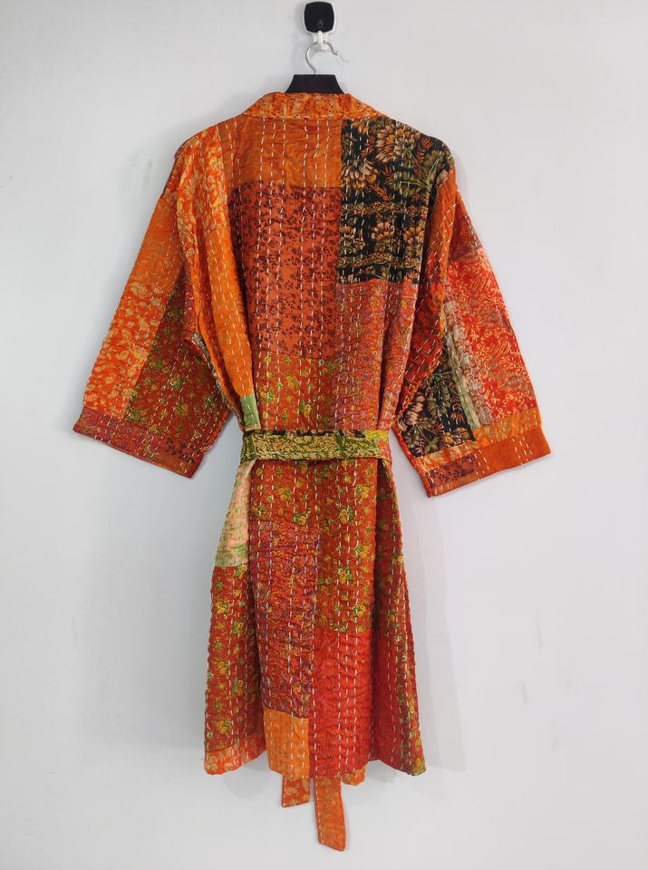 ชุดกิโมโนผ้าไหมผ้าฝ้ายสองชั้นสำหรับผู้หญิงเสื้อคลุมมีกระเป๋าและเข็มขัด