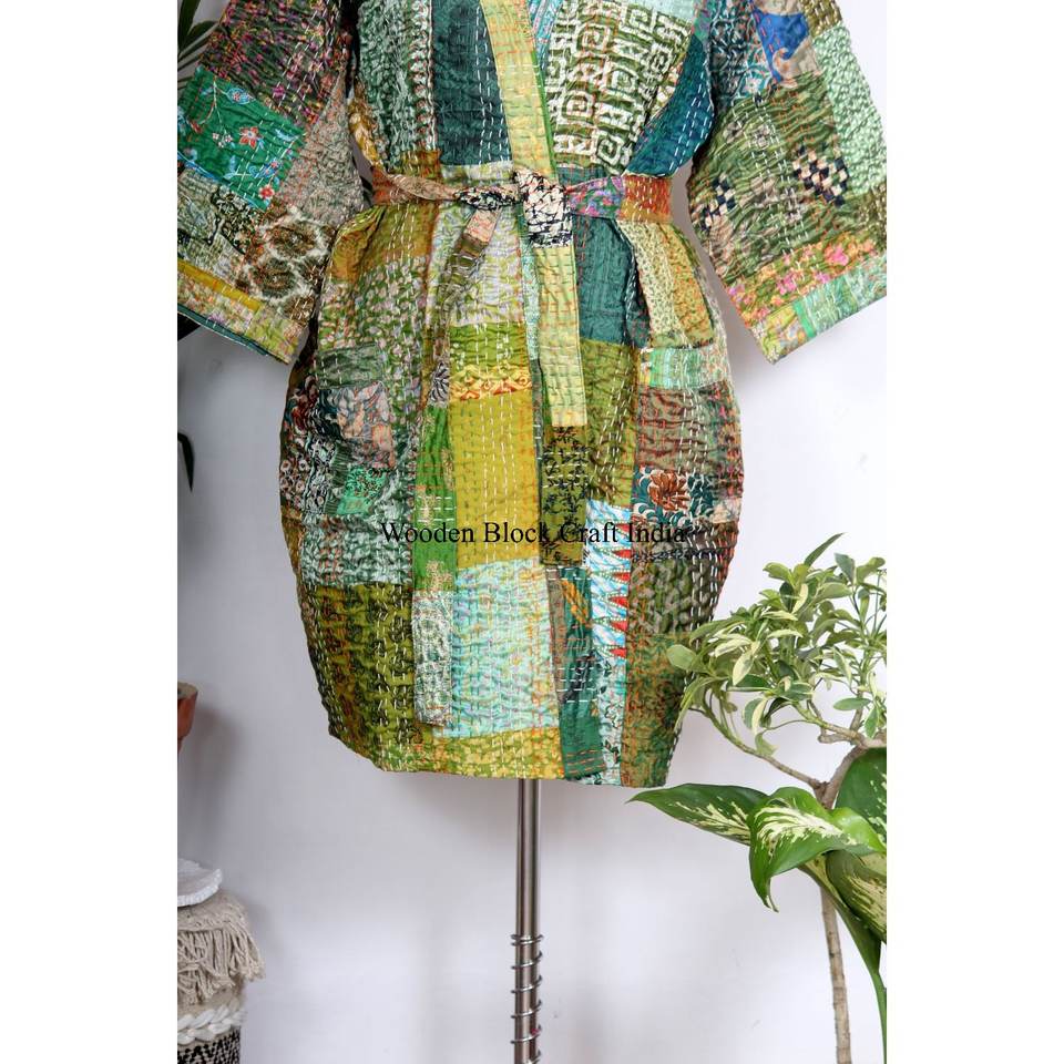 ชุดกิโมโนผ้าไหมคอตตอนปักลายคันธาสวยงาม ผ้าสองชั้น ทำมือสำหรับผู้หญิง พร้อมกระเป๋าและเข็มขัด