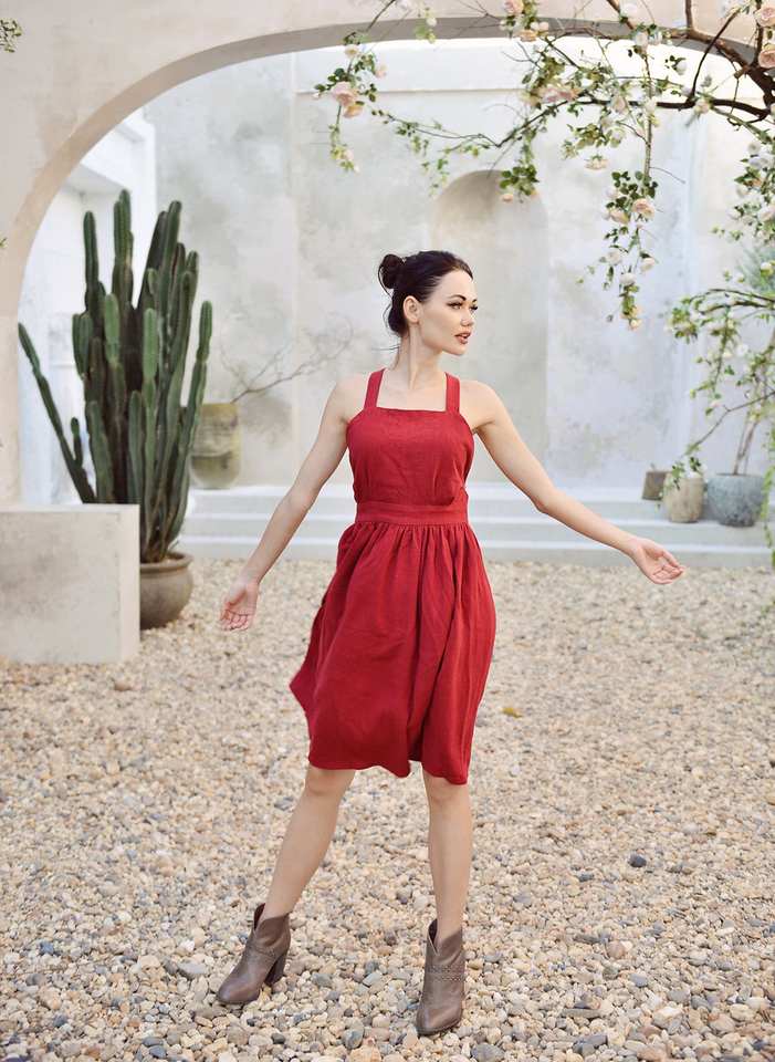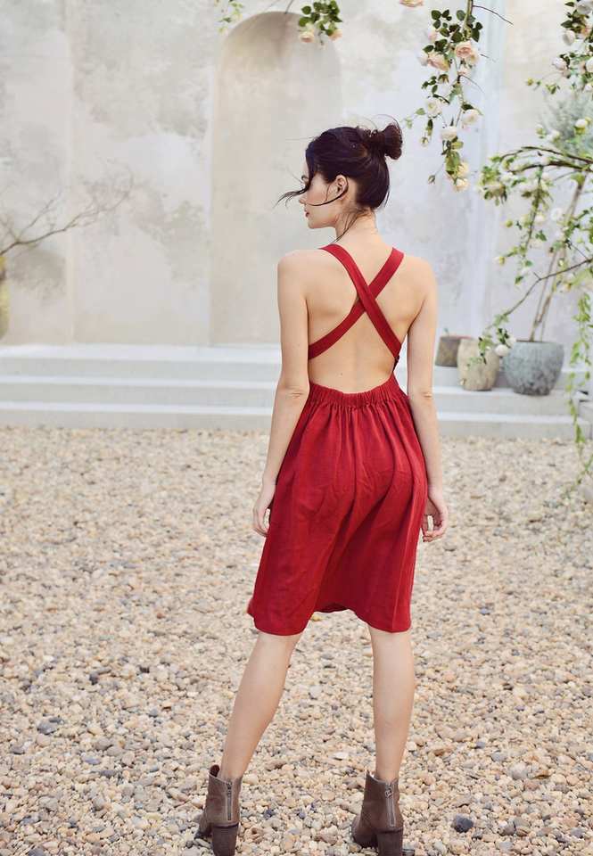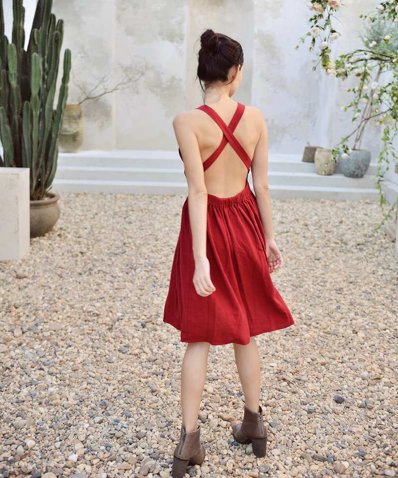 เดรสผ้าฝ้ายออร์แกนิกไขว้สวยงามเดรสลำลองแขนกุดเอวยางยืดเปิดหลังสีแดงชุดมิดิมีไซส์ใหญ่