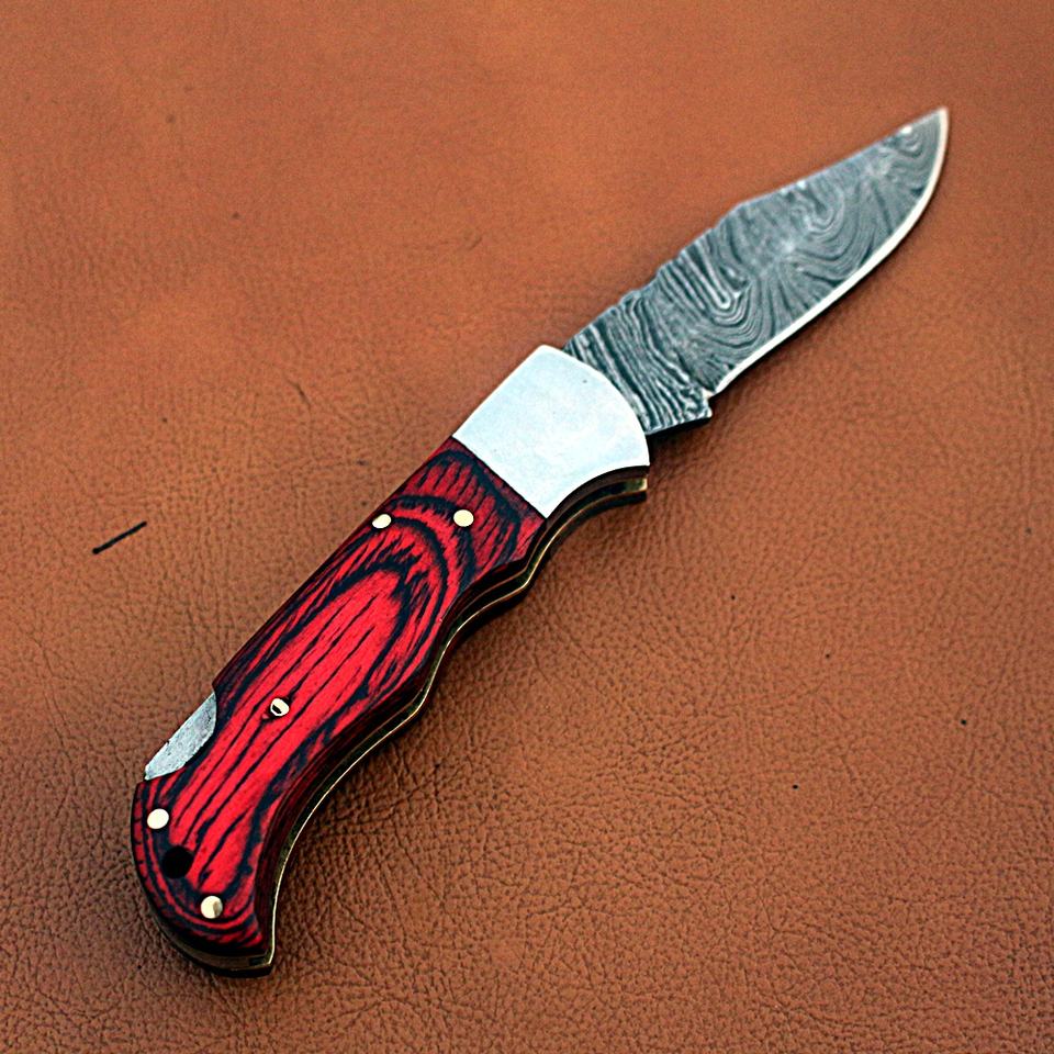 มีดพับเหล็กดามัสกัสทำมือสวยงาม ด้ามไม้ปักกะ ใบมีดทรงดรอปพอยต์ ทนทานสูง เหมาะสำหรับการล่าสัตว์กลางแจ้ง