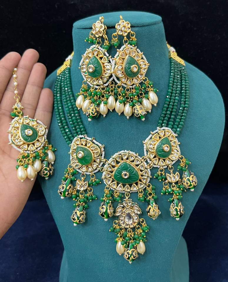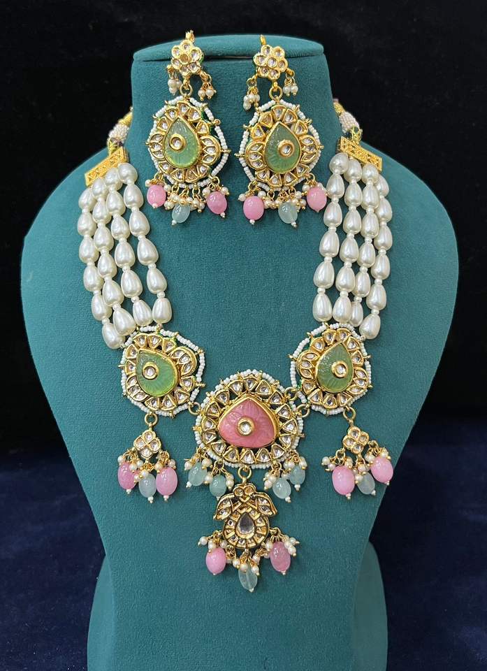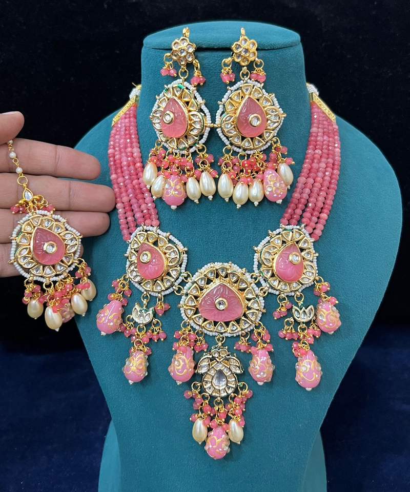 ชุดเครื่องประดับสร้อยคอลูกปัดแบบไม่ได้เจียระไนแบบสวยชุดเครื่องประดับสร้อยคอสำหรับงานแต่งงานของอินเดียพร้อมต่างหูสร้อยคอ Meenakari ที่ได้แรงบันดาลใจจากราชินี