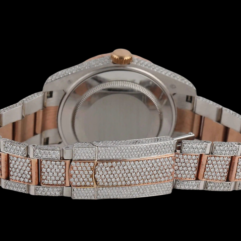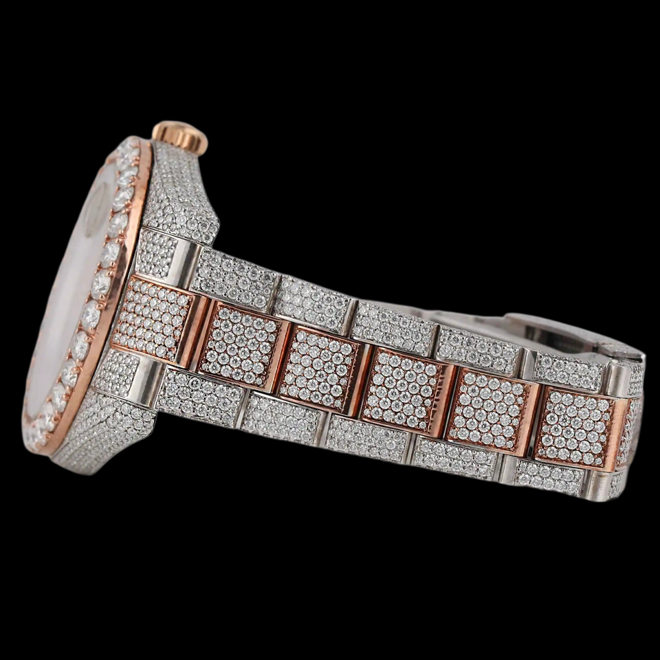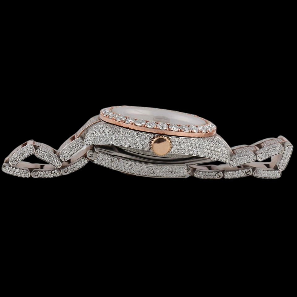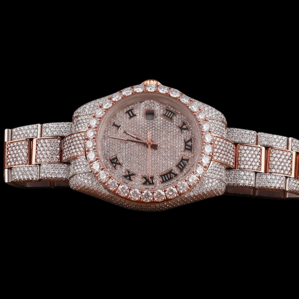นาฬิกาฮิปฮอปผู้ชายแบบสั่งทำพิเศษ ดีไซน์สวยงาม ประดับเพชรโมอิสซาไนต์ทรงกลมเต็มหน้าปัด ตัวเลขโรมันสองสี ตัวเรือนแบบ Bezel Setting