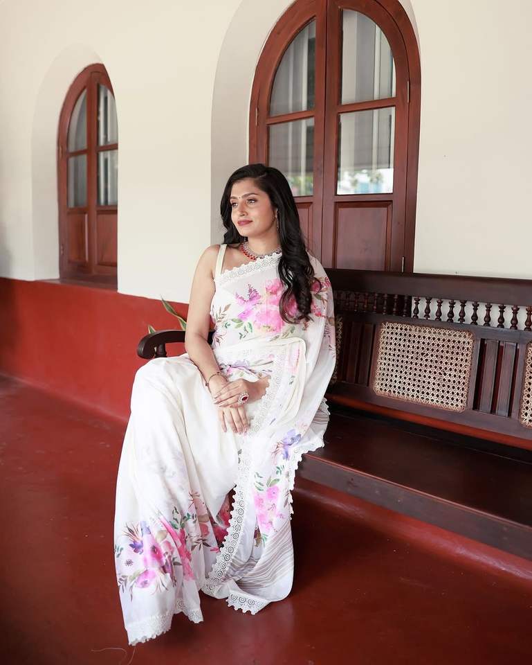 Saree นักออกแบบที่สวยงามด้วยการพิมพ์ดิจิตอลด้วยลูกไม้แฟนซี