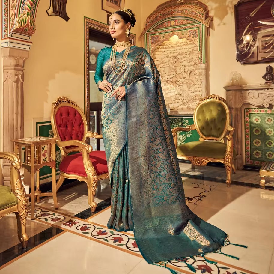 Designer Handloom Weaved Silk Saree Soft Beautiful Wedding & Party Wear for Indian Pakistani Culture with Copper Zari
