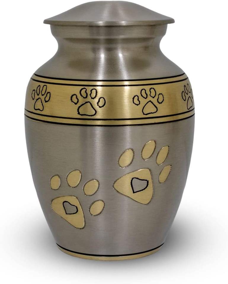 โกศบรรจุอัฐิรูปอุ้งเท้าสัตว์เลี้ยงสีทองเทาสวยงามสไตล์ยุโรป เป็นมิตรกับสิ่งแวดล้อม ทนทาน สำหรับใส่เถ้ากระดูกในพิธีศพ ทำจากโลหะ