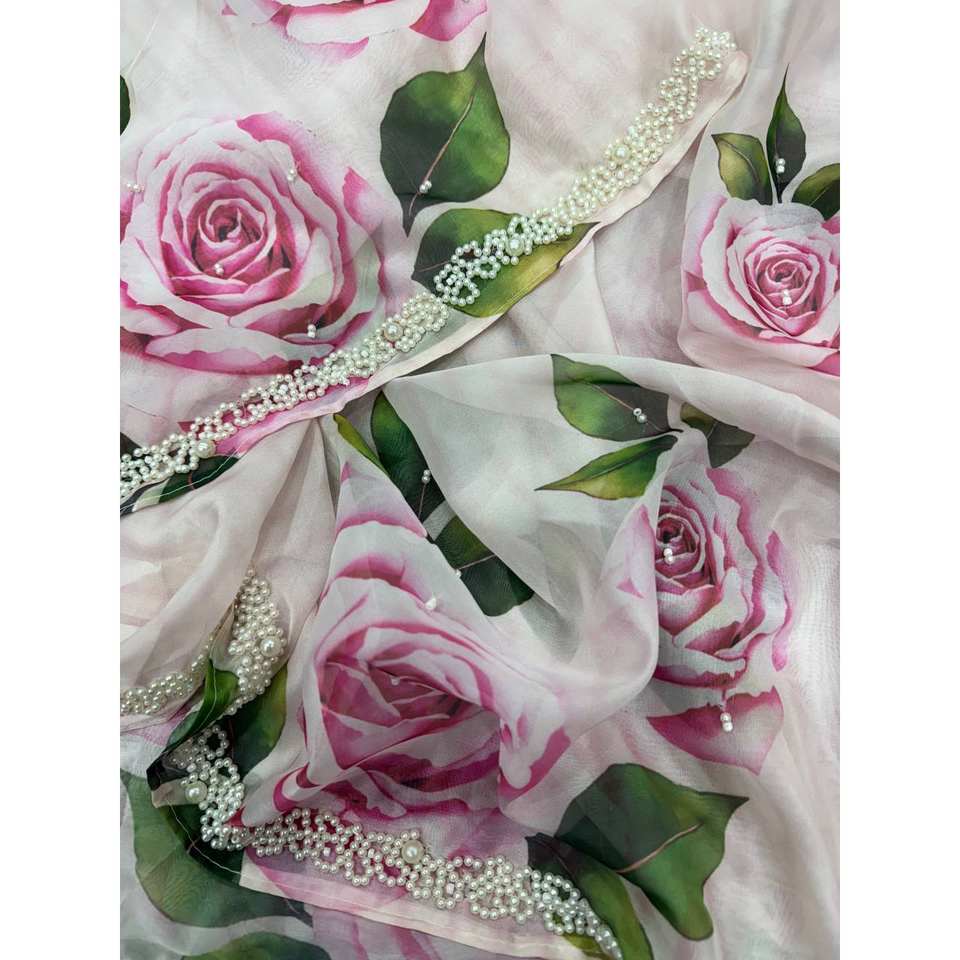 ชุดราตรีสวยงาม ลายดอกไม้ ผ้าส่าหรี ประดับมุกที่ขอบ สำหรับงานปาร์ตี้