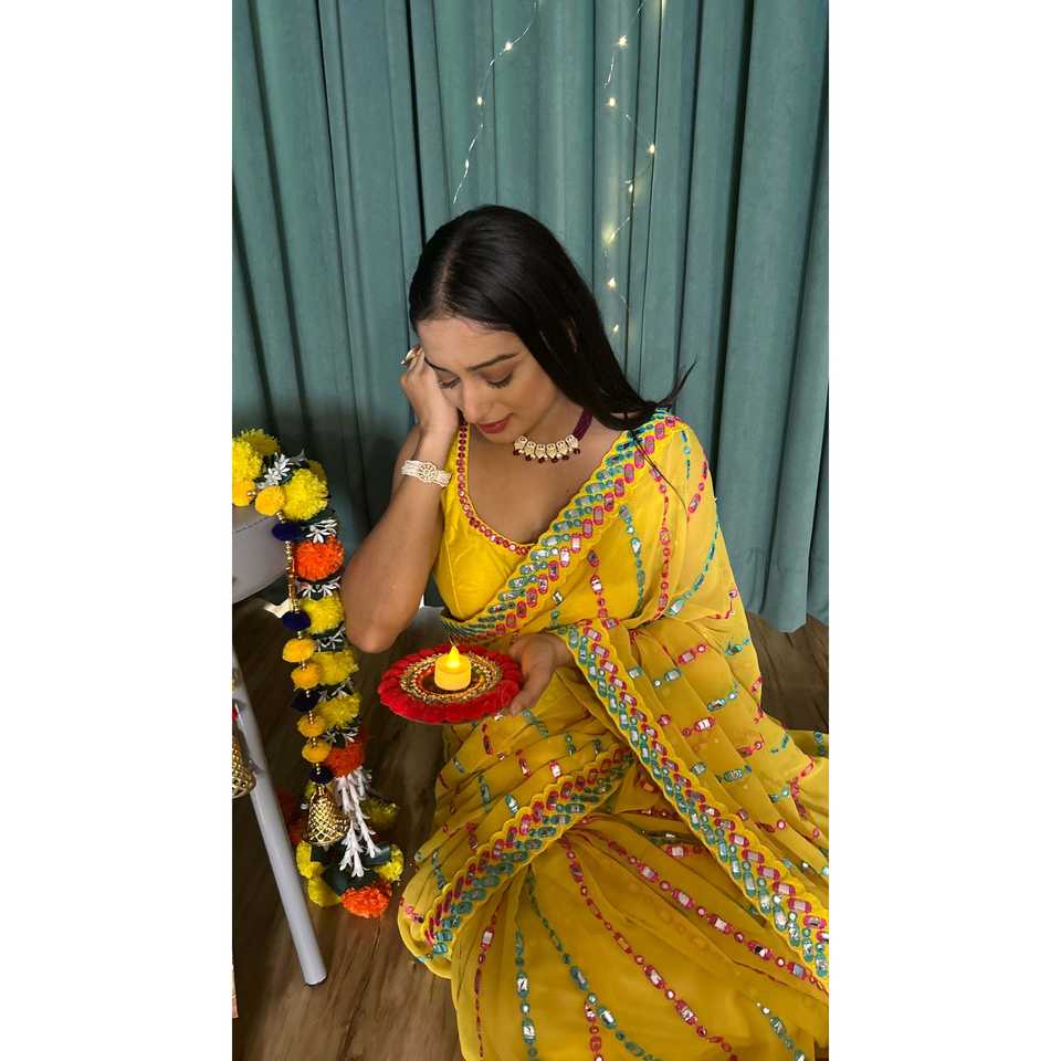 ผ้าส่าหรีชุดราตรีสวยพร้อมด้ายและกระจกกระดาษสำหรับงานปาร์ตี้