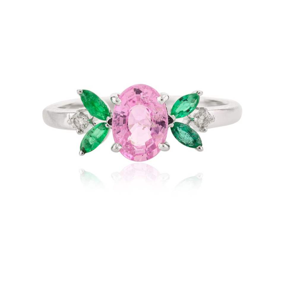 แหวนพลอยไพลินและเพชรทรงไข่แท้สีขาวทอง18K ลายดอกไม้สวยๆประดับพลอยเทียมสีชมพูมรกตหรูหรา