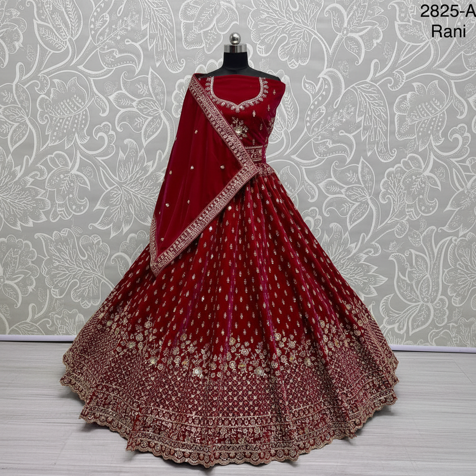 ชุดเลเฮนกาโชลีกำมะหยี่ปักลายดอกไม้สวยงาม สไตล์ลำลองสำหรับเจ้าสาว พร้อมผ้าคลุมไหล่สองชั้น