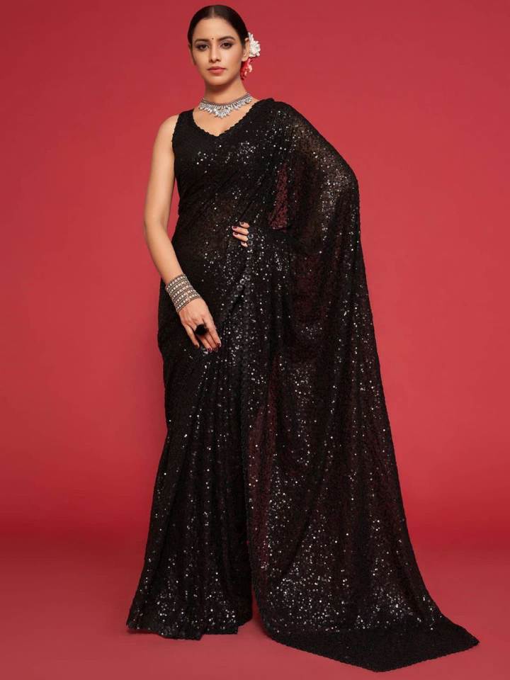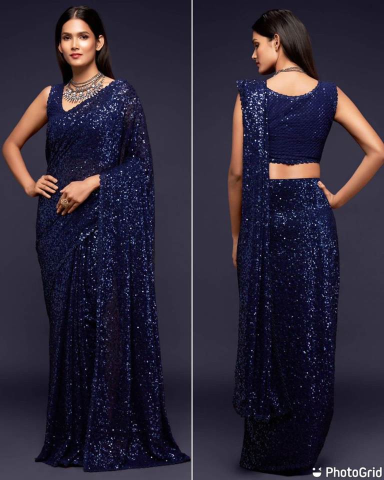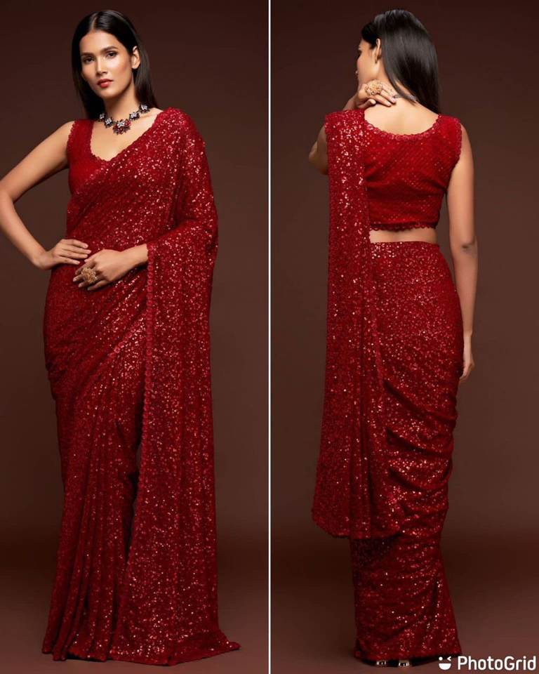 สารี Georgette ที่สวยงาม พร้อมงานลําดับต่างๆ สารีสําหรับงานแต่งงาน สารีปาร์ตี้ของนักออกแบบ