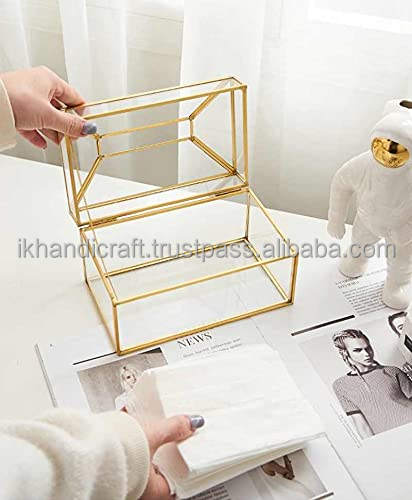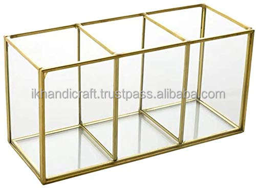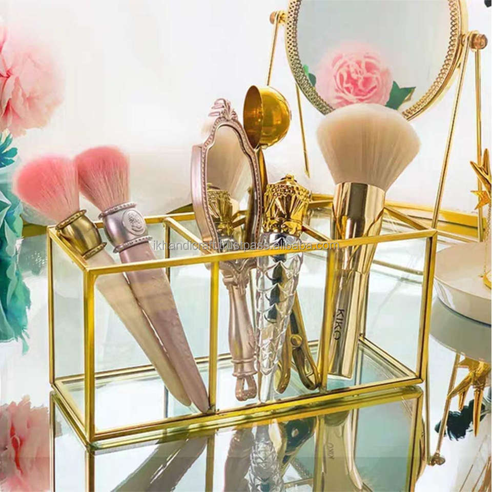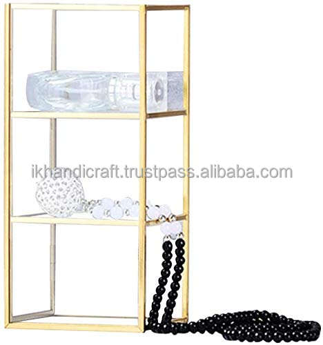 Beautiful Gold Decorative Makeup Organizer Slick Trending 3 Compartment Metal Clear Glass Display for Jewellery Beauty Products