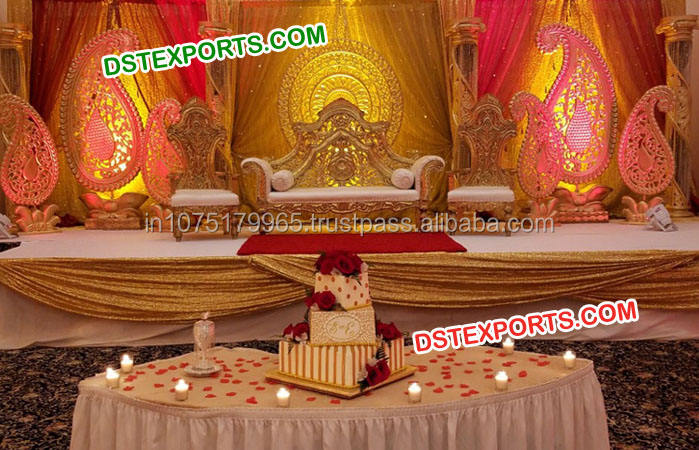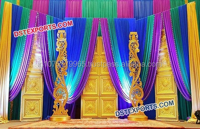 เสาแกะสลักสีทองที่สวยงามสำหรับงานแต่งงานขั้นตอนการแต่งงานของฮินดูที่สง่างามการตกแต่งบนเวที