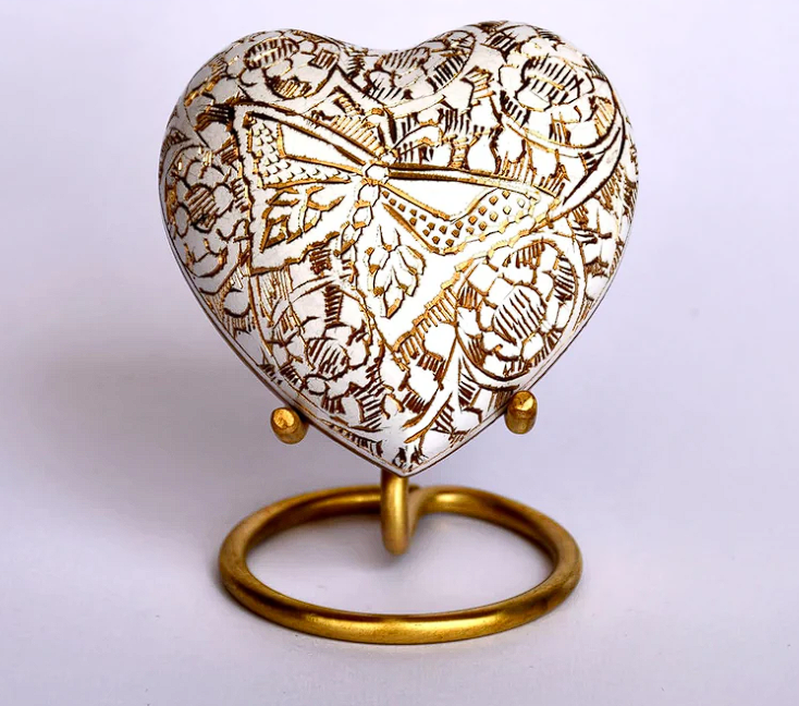 ที่เก็บอัฐิทองเหลืองสีขาวทองสวยงาม พร้อมลายสลักรูปหัวใจรูปผีเสื้อ พร้อมฐานตั้ง
