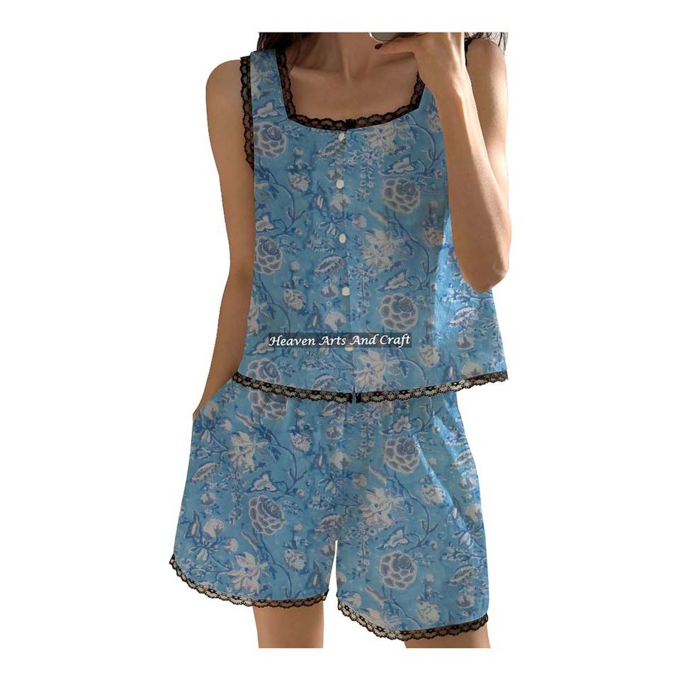 ชุดนอนขาสั้นผ้าฝ้ายพิมพ์ลายบล็อกสวยงาม แต่งขอบลูกไม้ ชุดนอนแขนกุดสำหรับฤดูใบไม้ผลิ/ฤดูร้อน ชุดนอนพิมพ์ลายบล็อก