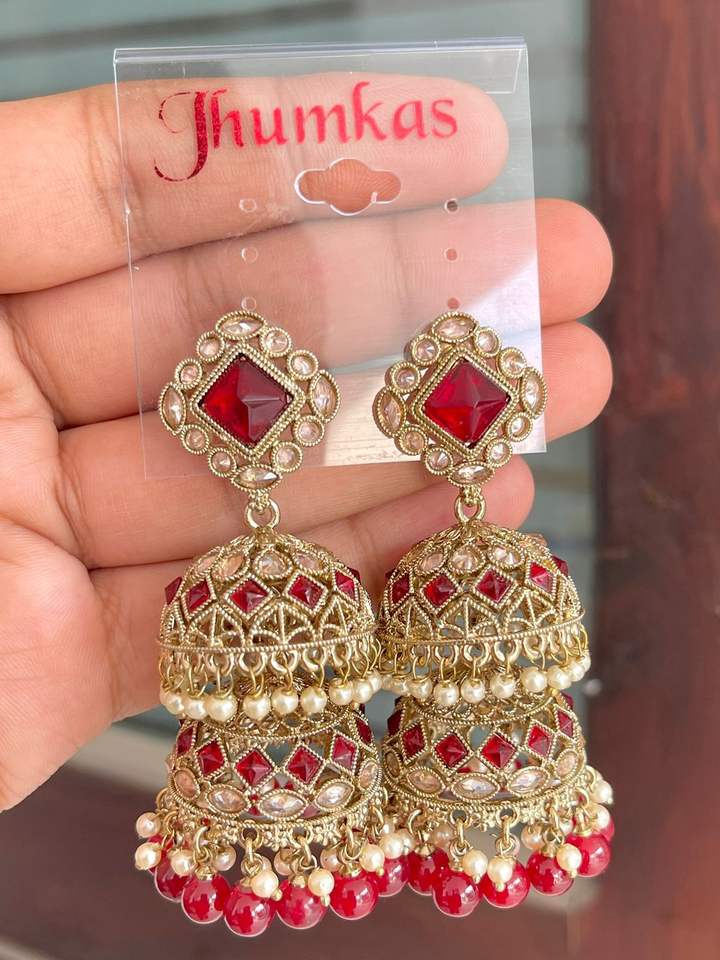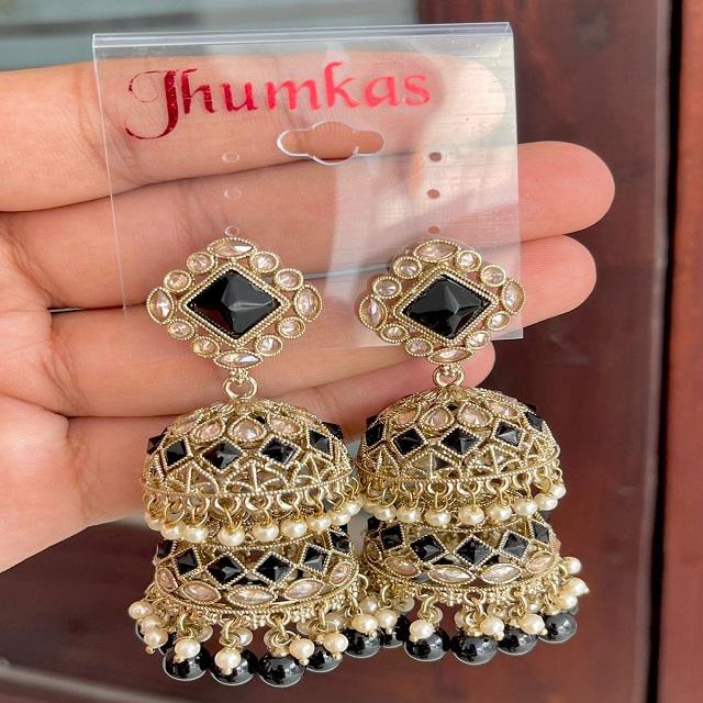 ต่างหู Jhumka ประดับเพชรสองชั้นแบบย้อนยุคสำหรับผู้หญิงต่างหูอินเดียแบบดั้งเดิม