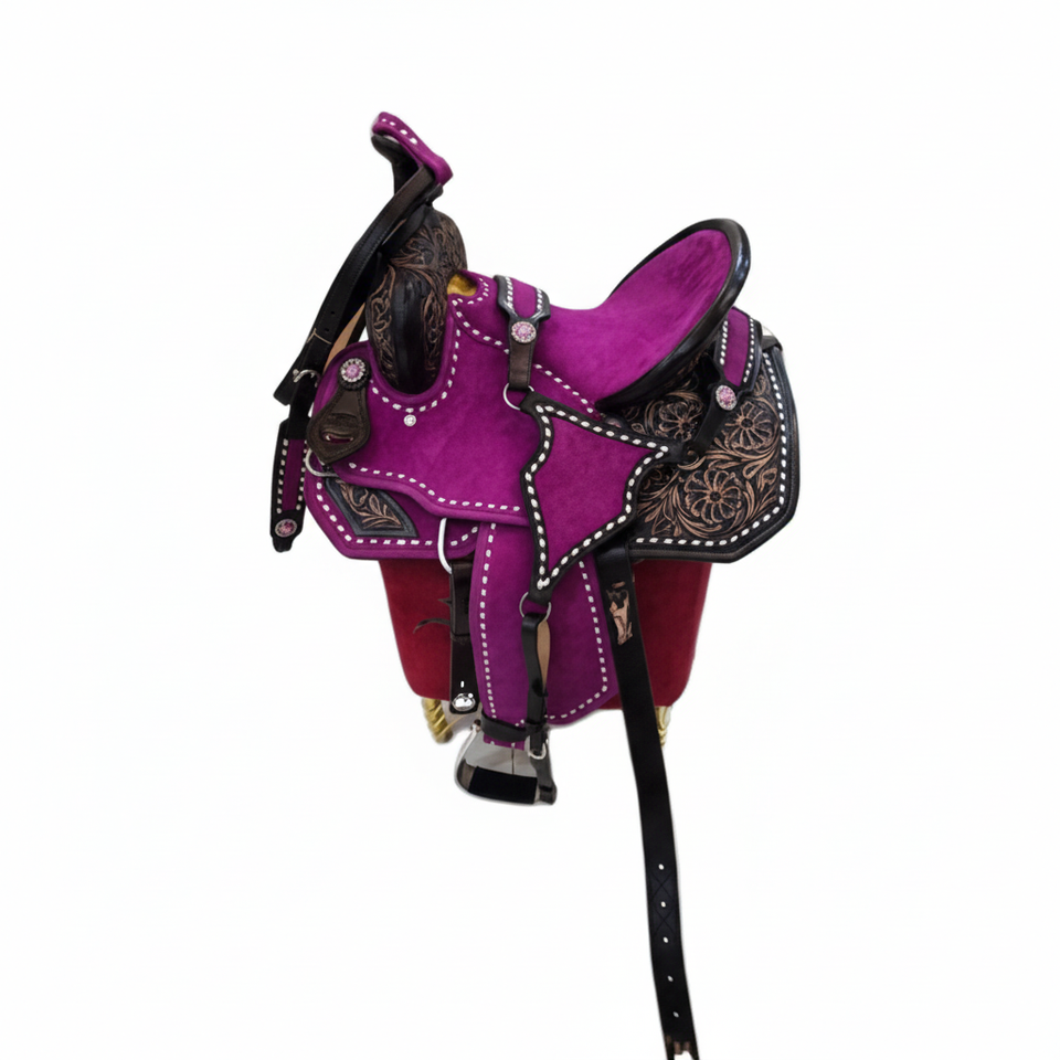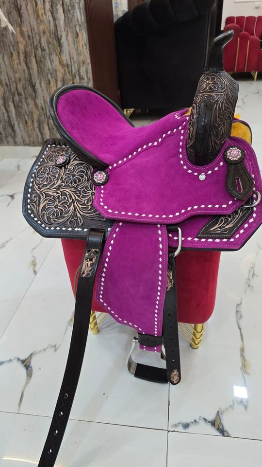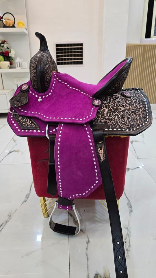 อานม้าหนังแท้สีชมพูสดใสสำหรับแข่งขันแบบเวสเทิร์น อานม้าแบบพกพาสำหรับขี่ม้า อานม้าออกแบบพิเศษ