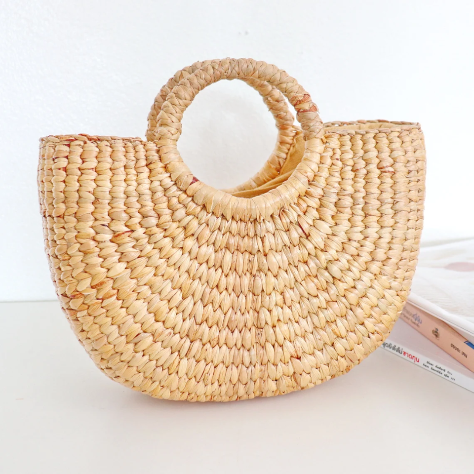 กระเป๋าหวายลายดอกไฮยาซินธ์สวยงาม สีน้ำตาลอ่อน ตะกร้าหวายสานมือ ตกแต่งดอกไม้ ประดับประตู สำหรับเทศกาล ผลิตในเวียดนาม TUYET DUNG