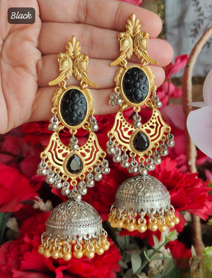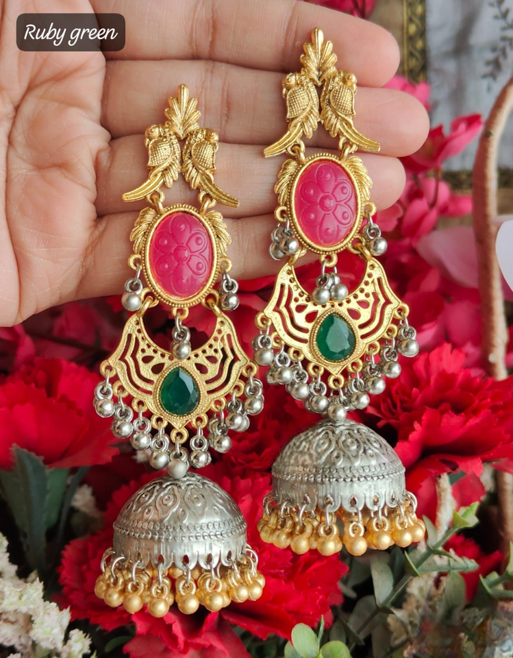 Jhumkas ในโทนคู่กับหินแกะสลักเคลือบและสไตล์ ghungroo jhumka