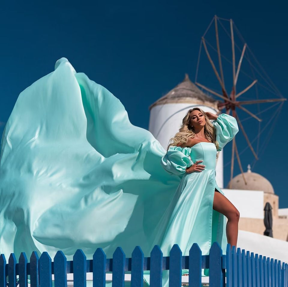 ชุดเดรสบินซาตินยาวสวยงามสําหรับการถ่ายภาพ Santorini ชุดเดรสบินไหลสําหรับผู้หญิง