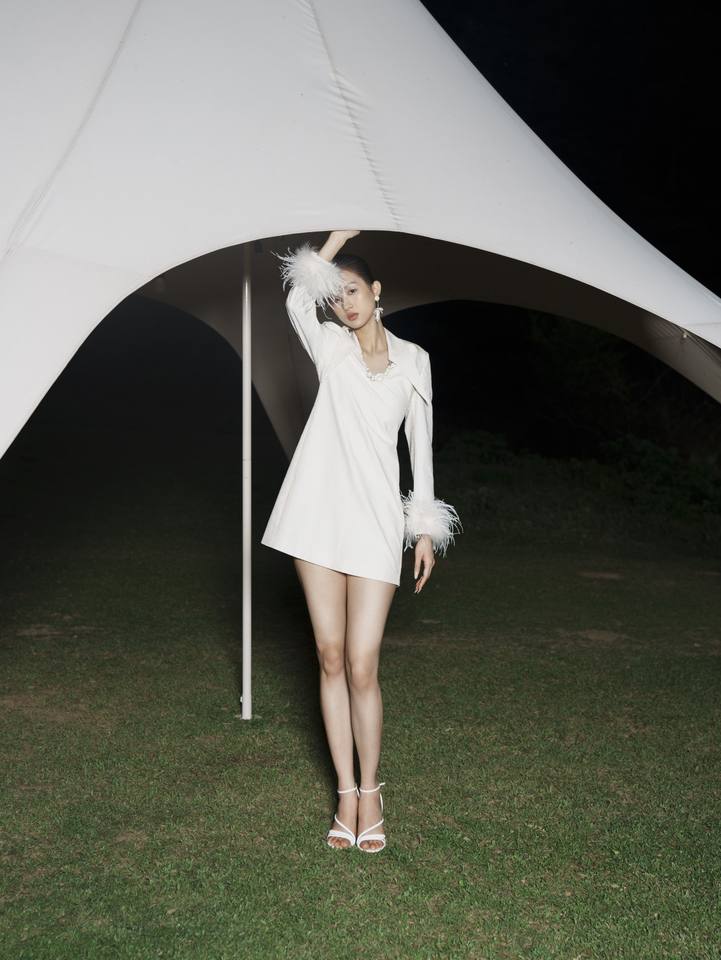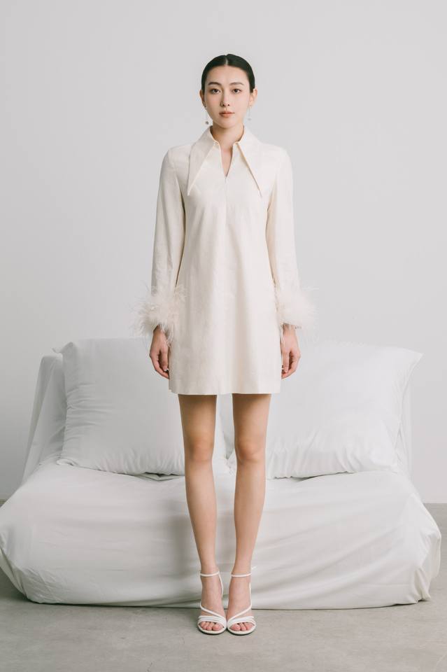 เดรสมิดิสั้นแขนยาวสุดหรูสวยเดรสมินิผ้าแจ็คการ์ดประดับขนนกผ้าฝ้ายลายดอกไม้มีสไตล์
