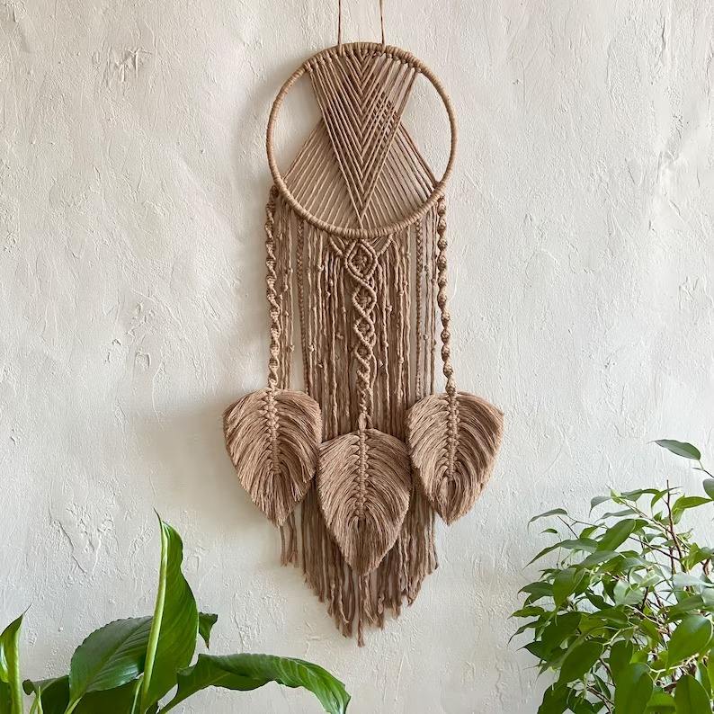 เครื่องดักฝันมาคราเม่สวยงาม ตกแต่งผนัง ทำจากวัสดุธรรมชาติ ทำด้วยมือ คุณภาพสูง สีและขนาดปรับแต่งได้ ของตกแต่งบ้าน