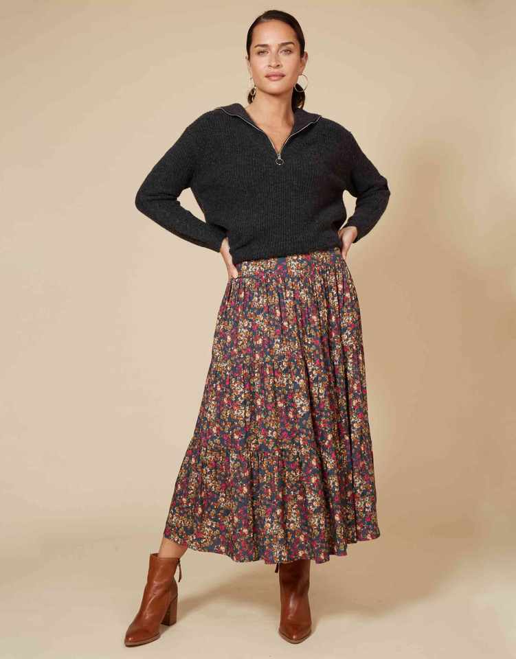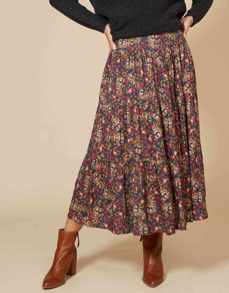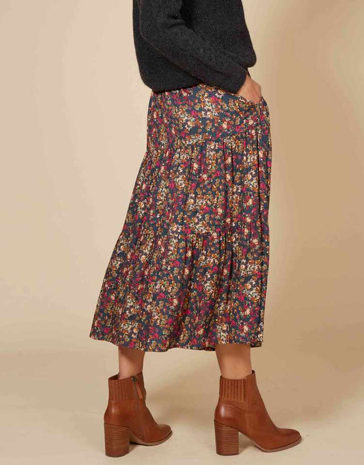 กระโปรงทรงเอ midi สวยงาม เอวสม็อค ด้านหน้าเรียบ ทรงเอไลน์ จับจีบเป็นชั้นๆ มีกระเป๋าข้าง ลายดอกเล็กๆ สำหรับผู้หญิง