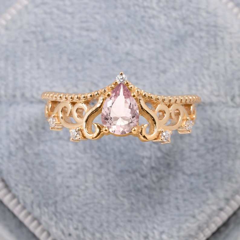 แหวนแต่งงานมอร์แกไนท์และเพทายที่สวยงาม925เงินสเตอร์ลิง14K มงกุฎทองทรงหยดน้ำเครื่องประดับสำหรับเจ้าสาว