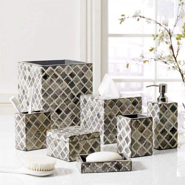 Beautiful Mother Of Pearl Bathroom Accessory Set Bowl Adding Glamour To Powder Room Arrangement