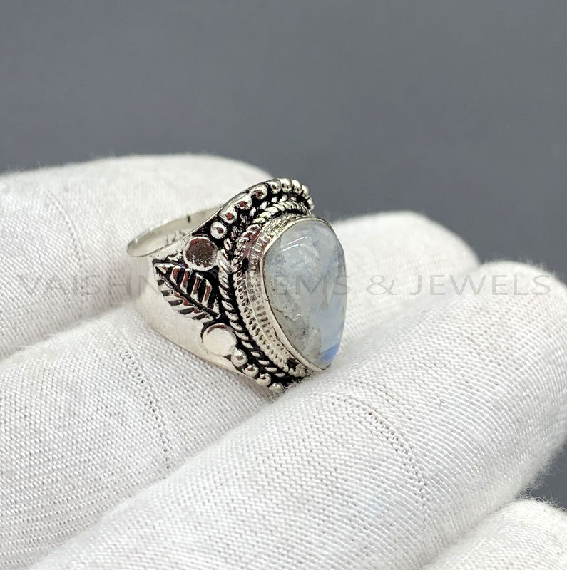 แหวนพลอยมูนสโตนสีรุ้งธรรมชาติที่สวยงามขนาด9X13มม. รูปทรงลูกแพร์925เงินสเตอร์ลิงแฮนด์เมดเครื่องประดับใบอัญมณีโบฮีเมียนแบบโบฮีเมียน