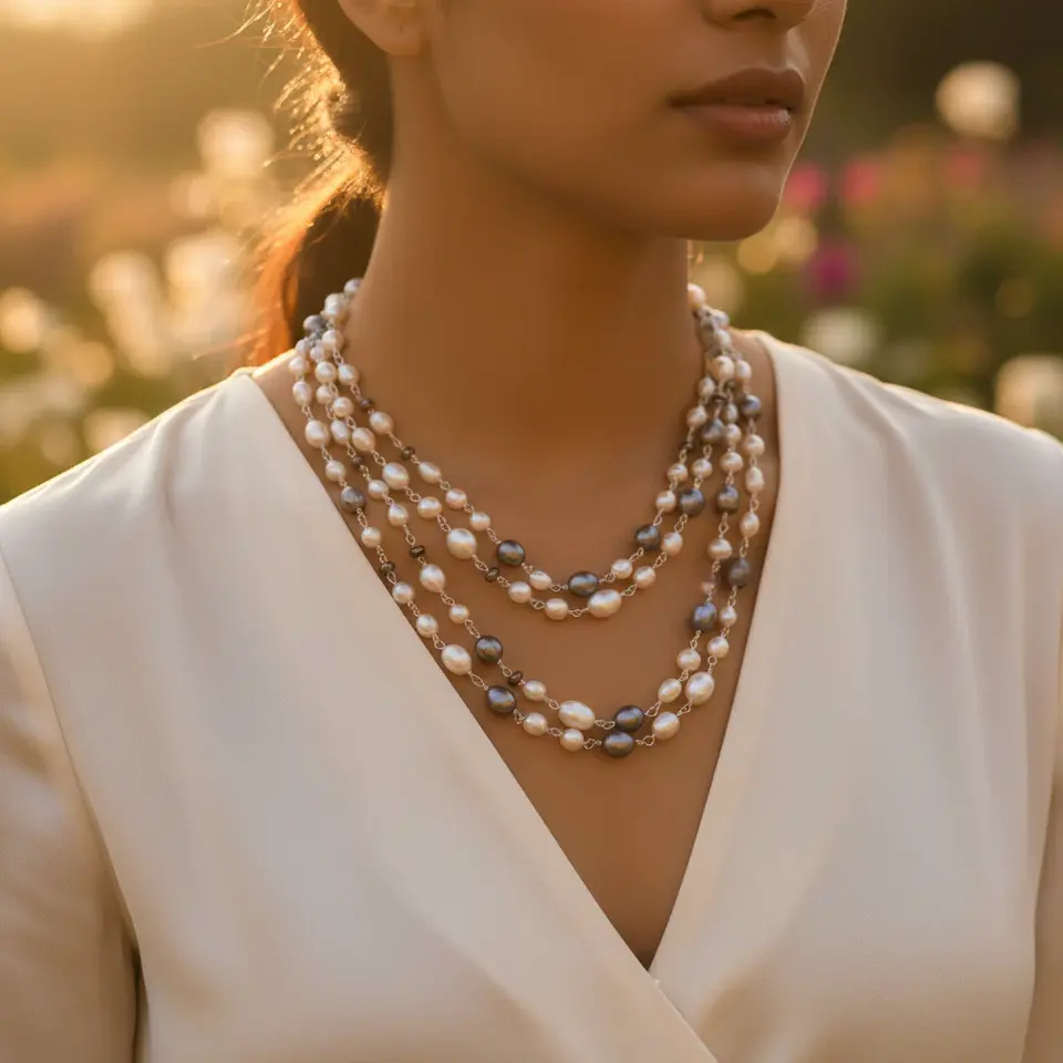 สร้อยคอมุกสวยงามพร้อมสายเงินแท้สำหรับผู้หญิง