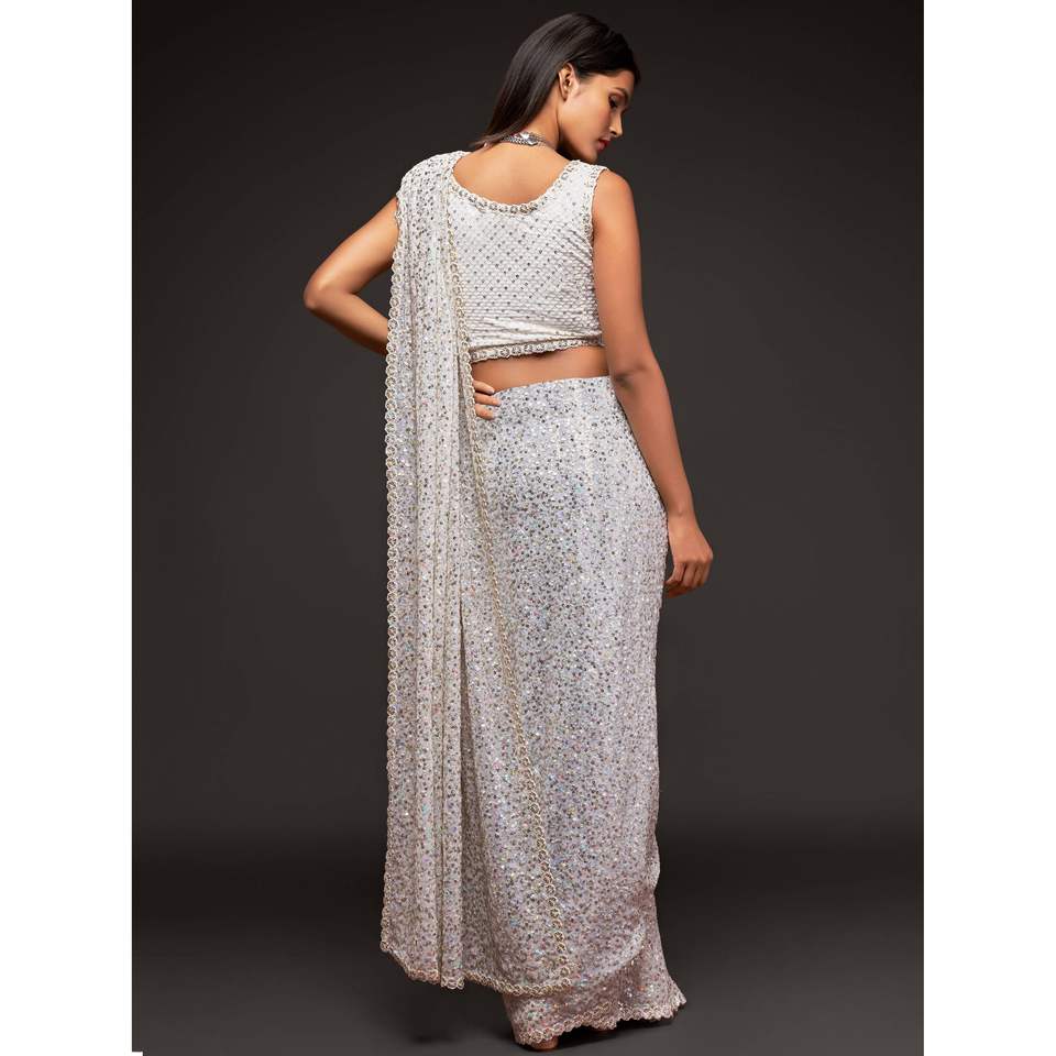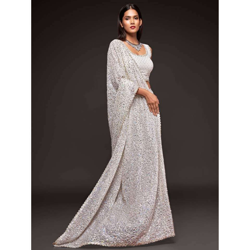 ชุดส่าหรีประดับด้วยเลื่อมสีขาวมุกสวยงามสำหรับงานปาร์ตี้
