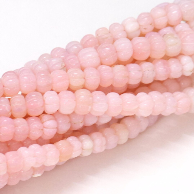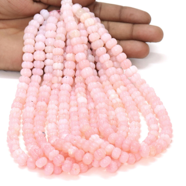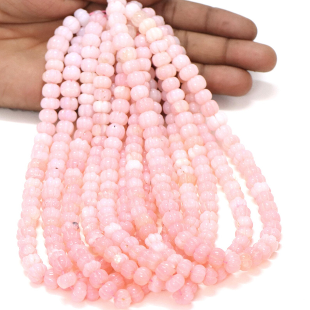 ลูกปัดโอปอลสีชมพูสวยงาม รูปทรงแตงโมแกะสลัก ขนาด 15 นิ้ว 8-11 มม. ลูกปัดโอปอลสีชมพูแกะสลักด้วยมือ รูปทรงฟักทอง