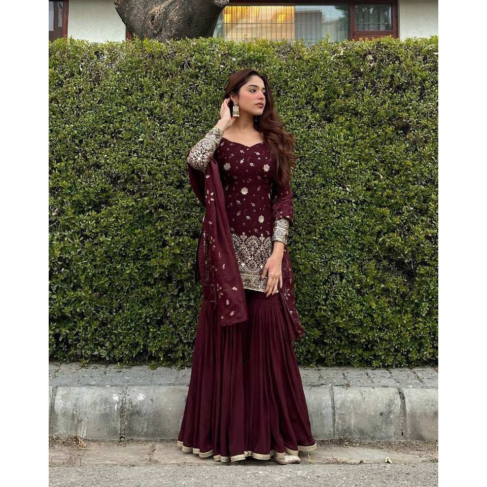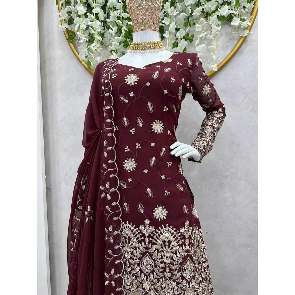 ชุดสัลวาร์ คามีซ ผ้าโพลีเอสเตอร์สวยงาม พร้อมเสื้อและกางเกงพร้อมผ้าคลุมไหล่ ประดับด้วยงานปักดิ้นและเลื่อม ไซส์ XL สำหรับงานแต่งงาน