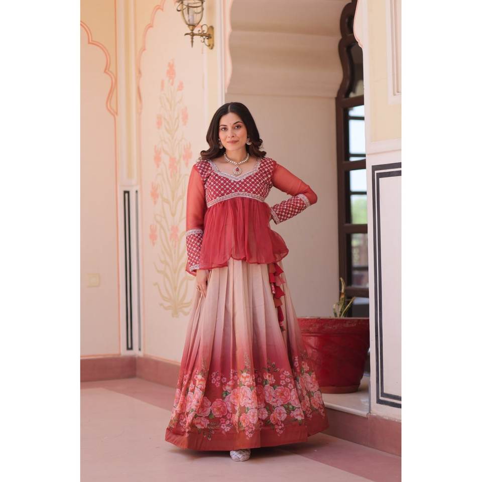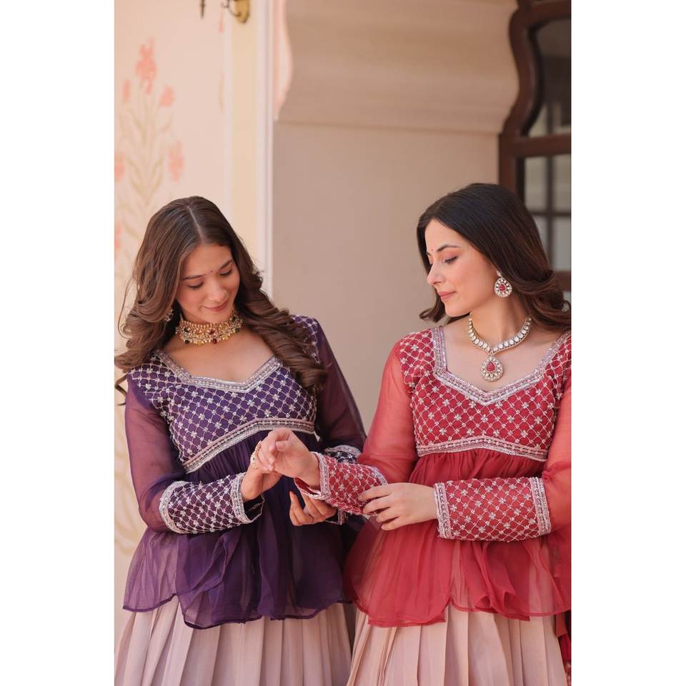 ชุดเลเฮนกาโชลีลายดอกไม้สีม่วงสวยงาม ไซส์ M สำหรับงานเลี้ยงตอนเย็น