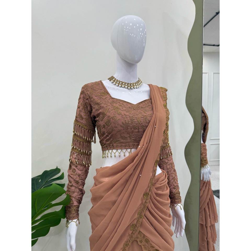 ส่าหรี lehenga ที่สวยงามพร้อมสวมใส่สำหรับปาร์ตี้เครื่องประดับชาติพันธุ์ที่สง่างาม