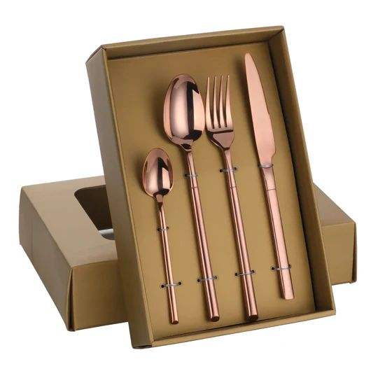 การเคลือบสีโรสโกลด์ที่สวยงามให้ความรู้สึกหรูหราและมีระดับในการตกแต่งโต๊ะอาหาร วัสดุที่แข็งแรง ทนทาน ป้องกันสนิม และปลอดภัยสำหรับอาหาร